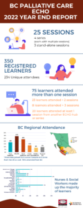 Looking ahead to 2023, the BCCPC’s Palliative Care ECHO Program is looking at another year of dramatic growth with an impressive variety of themes, topics and sessions. ECHO’s ‘all learn, all teach’ approach has found popularity among our stakeholders in BC, and the program’s practice of co-creating the sessions results in content that is developed with, not for, the learners.