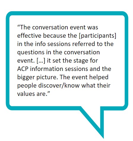The pilot phase of the project tailoring community-led Advance Care Planning (ACP) programs for those living with dementia concluded last month. In partnership with four partner organizations, we piloted and evaluated the guided group conversation event and two-part ACP information sessions. Along with providing a full toolkit of resources, the project team also trained staff and volunteers from each organization to become ACP facilitators for people living with early stages of dementia and their family and friends.