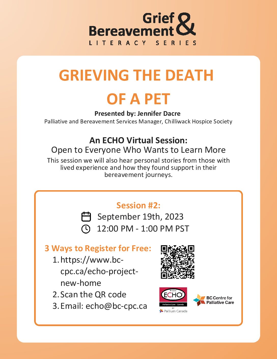 Sign up now for session 2: The second virtual session of the series will be held on Tuesday, September 19, 12:00pm – 1:00pm (PST) is on the topic “Grieving the Death of a Pet“. This session will be presented by Jennifer Dacre, Palliative & Bereavement Services Manager at Chilliwack Hospice. In addition to Jennifer’s educational presentation, we will hear personal stories from those with lived experience and how they found support in their bereavement journeys. Register now.