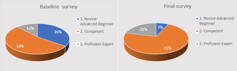 One of the objectives of this ECHO series is to increase competencies, and based on survey results, this was successful. When asked in a baseline survey before the cohort started and the final survey “how would you describe your psychosocial palliative competency?”, the difference was remarkable. Those who self-described as Novice-Advanced Beginner dropped 80%, and those who self-described as Proficient-Expert almost doubled.