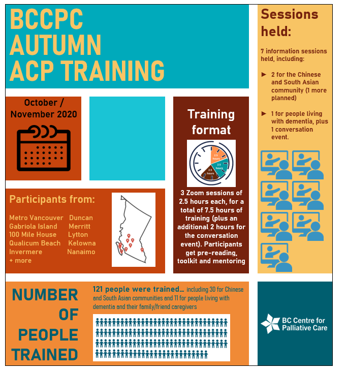 The Fall training activities are part of BCCPC’s efforts to support community partners across BC to raise public awareness of the importance of ACP and to help people in their communities to get their wishes for future care expressed and known.
